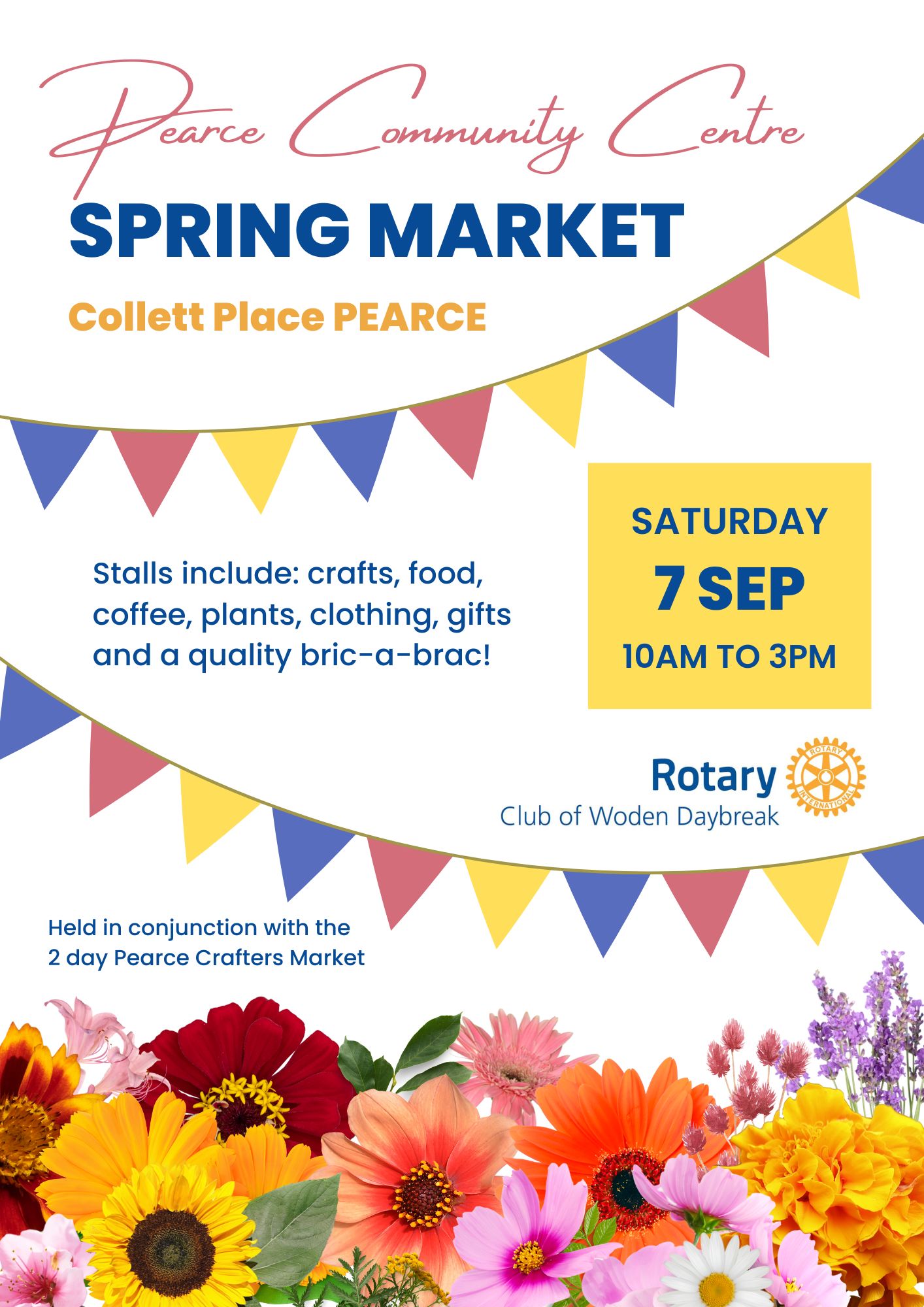 The Pearce Community Centre Spring Market is held in conjunction with the Pearce Crafters Market at the Pearce Community Centre: Collett Pl, Pearce ACT 2607.