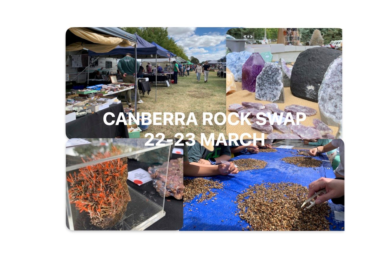 he 2025 Rock Swap held by the Canberra Lapidary Club is where you will find dealers and fossickers selling amazing rock and mineral specimens, opals, fossils, crystals, beautiful jewellery, lapidary supplies and so much more.So many fantastic pieces to start a collection or add more, you will be sure to find something of interest!