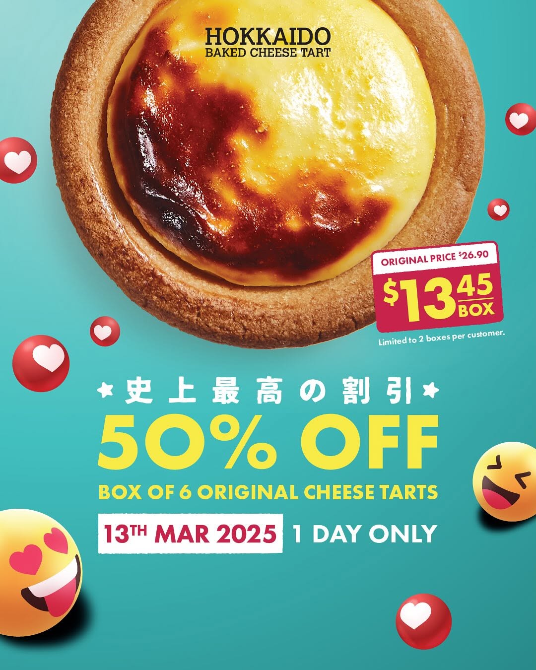 Mark your calendars! On 13th March 2025, grab a box of 6 Original Cheese Tarts for just $13.45 (originally $26.90)—HALF PRICE! 😍