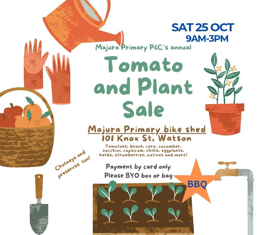 Majura Primary Parents and Citizens Association annual plant sale will be held at 101 Knox St in the bike shed.Come and grab your tomatoes, veggies, native plants and produce.