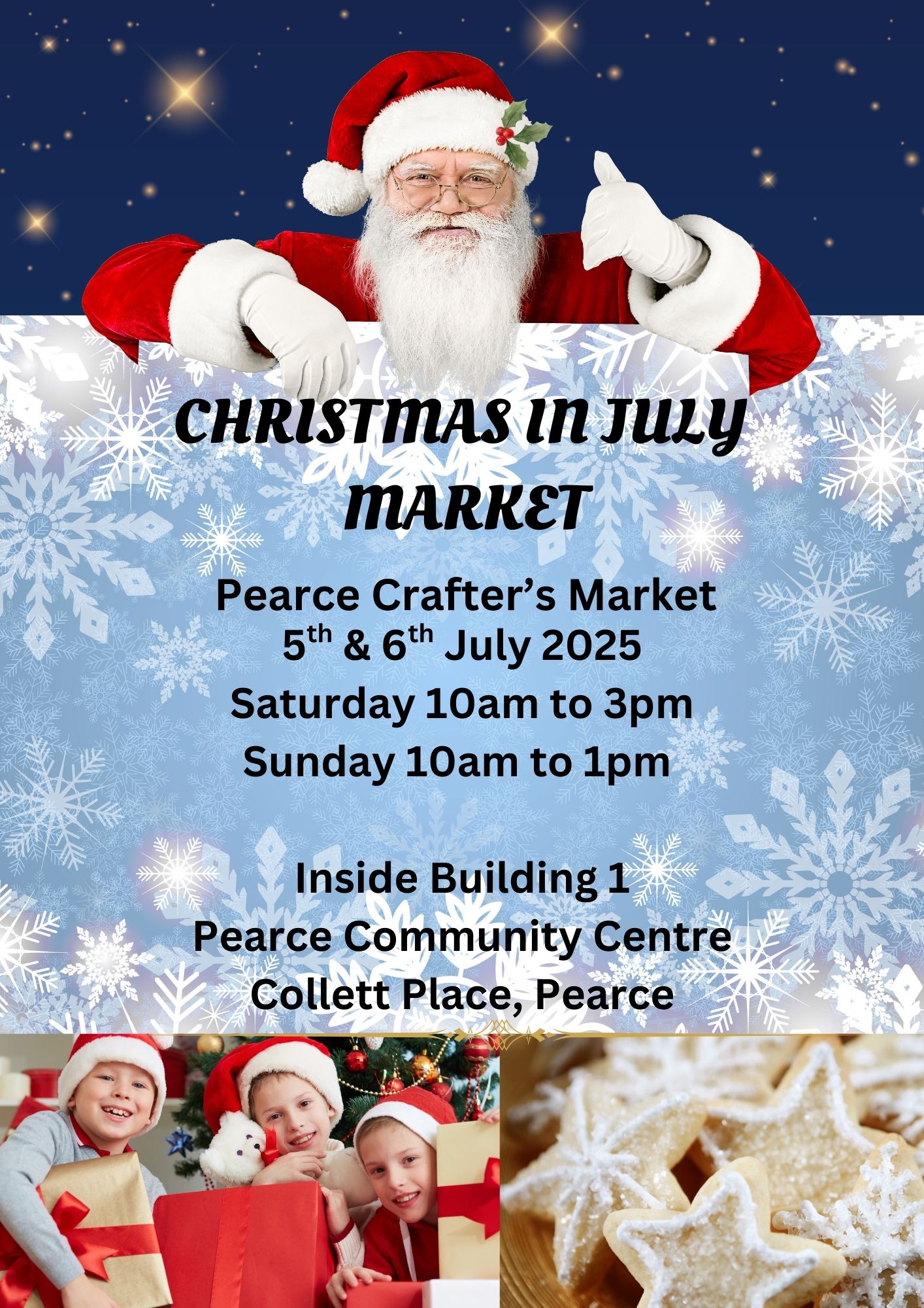 Pearce Crafter's Market - Christmas in July July 5 & 6 Come to our amazing Christmas in July Market - where there is something for everyone. We have Christmas goodies as well as beautiful products from our amazing stalls. Santa will be available from 10am to 2pm on Saturday only and has a gift for every child. 💌 Share 🙋♂️ What is this page?