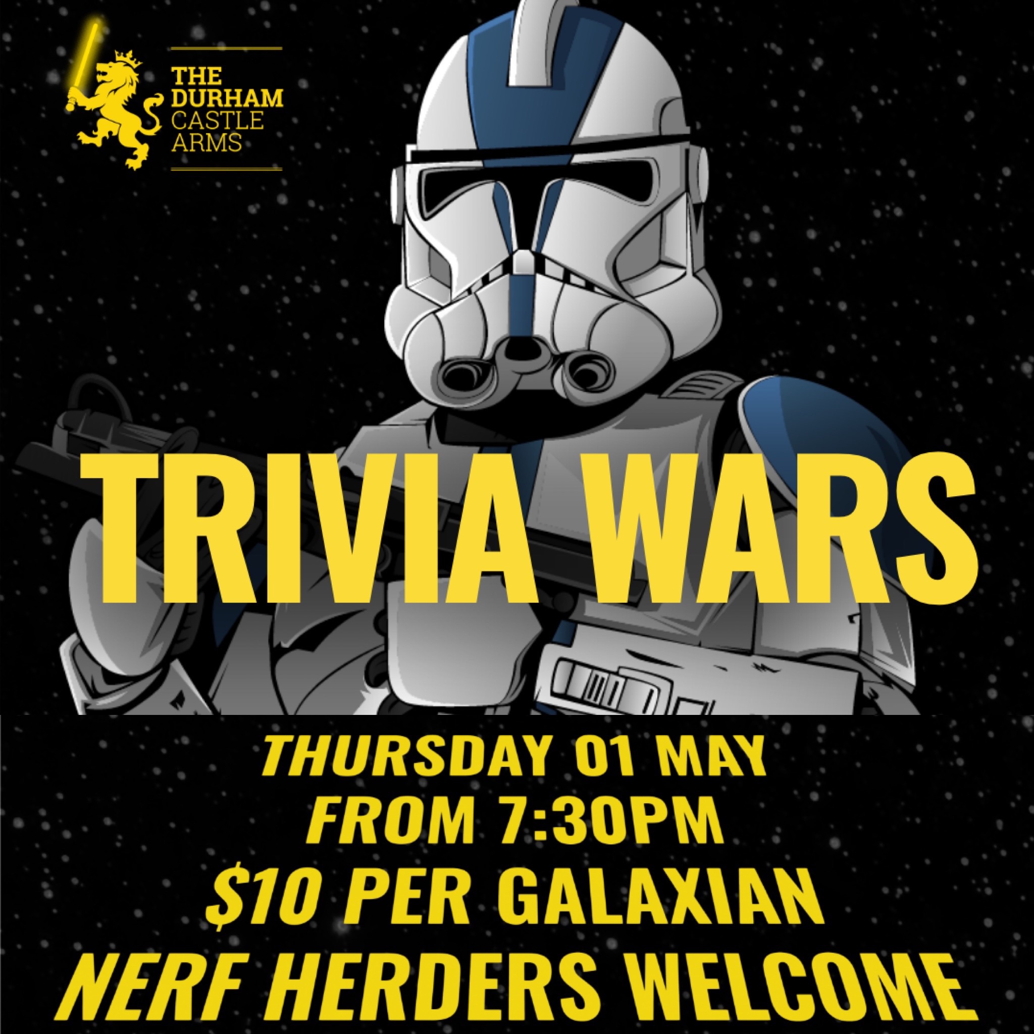 Star Wars Trivia at The Durham Thursday May 1 - 7:30pm Is this the Trivia you were looking for?Star Wars Trivia returns once more to the Durham with all new questions relating to a galaxy far, far away$10 per person with great prizes available and a special lucky door prize! 💌 Share 🙋♂️ What is this page?
