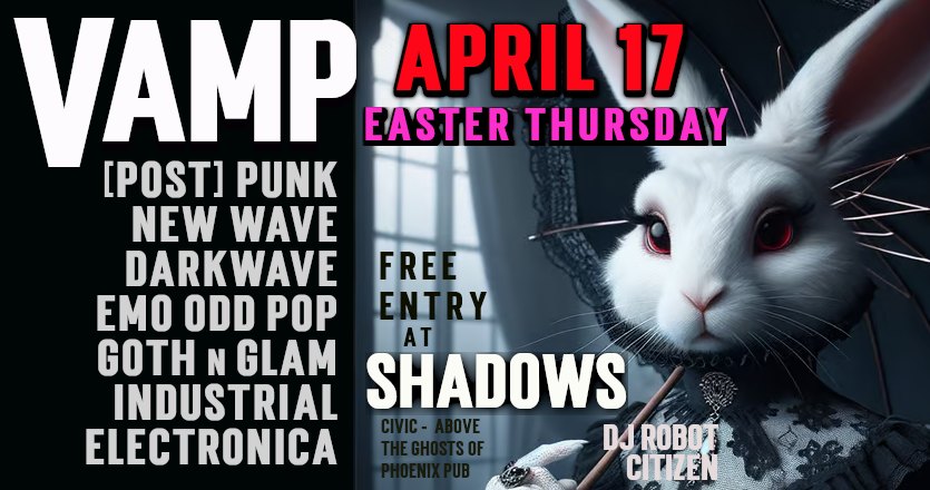 VAMP ::: EASTER THURSDAY APRIL 17 ... a mix of music across the genres of Odd Pop New Wave Darkwave PostPunk Gothic-Glam-Art Rock Industrial E.B.M. plus some Emo & Electronica [see list of artists/bands below] with a welcoming of requests!