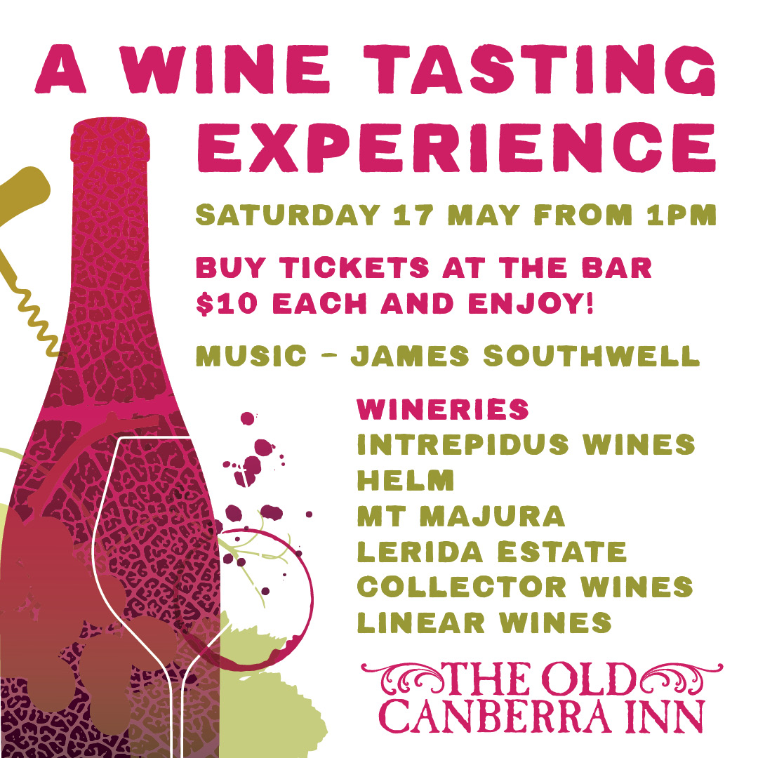Wine Tasting Experience Saturday May 17 - 1pm Join us Saturday 17 May from 1pm to try some of our best local wines. Guests wineries include Intrepidus Wines, Helm, Mt Majura, Lerida Estate, Collector Wines and Linear Wines. Tickets are $10 each at the bar - then taste away! 💌 Share 🙋♂️ What is this page?